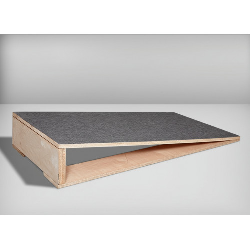 Мостик изготовлен из древесины, имеет прямую конструкцию, без пружин. Размеры изделия составляют 1200х600х185 мм. Верхняя площадка соединяется с основанием с помощью фанерной опоры, что делает мостик жестким. Верхняя поверхность покрыта ковролином, который обеспечивает хорошее сцепление, не дает скользить. Такой вид оборудования подходит для использования в школьных спортзалах.
